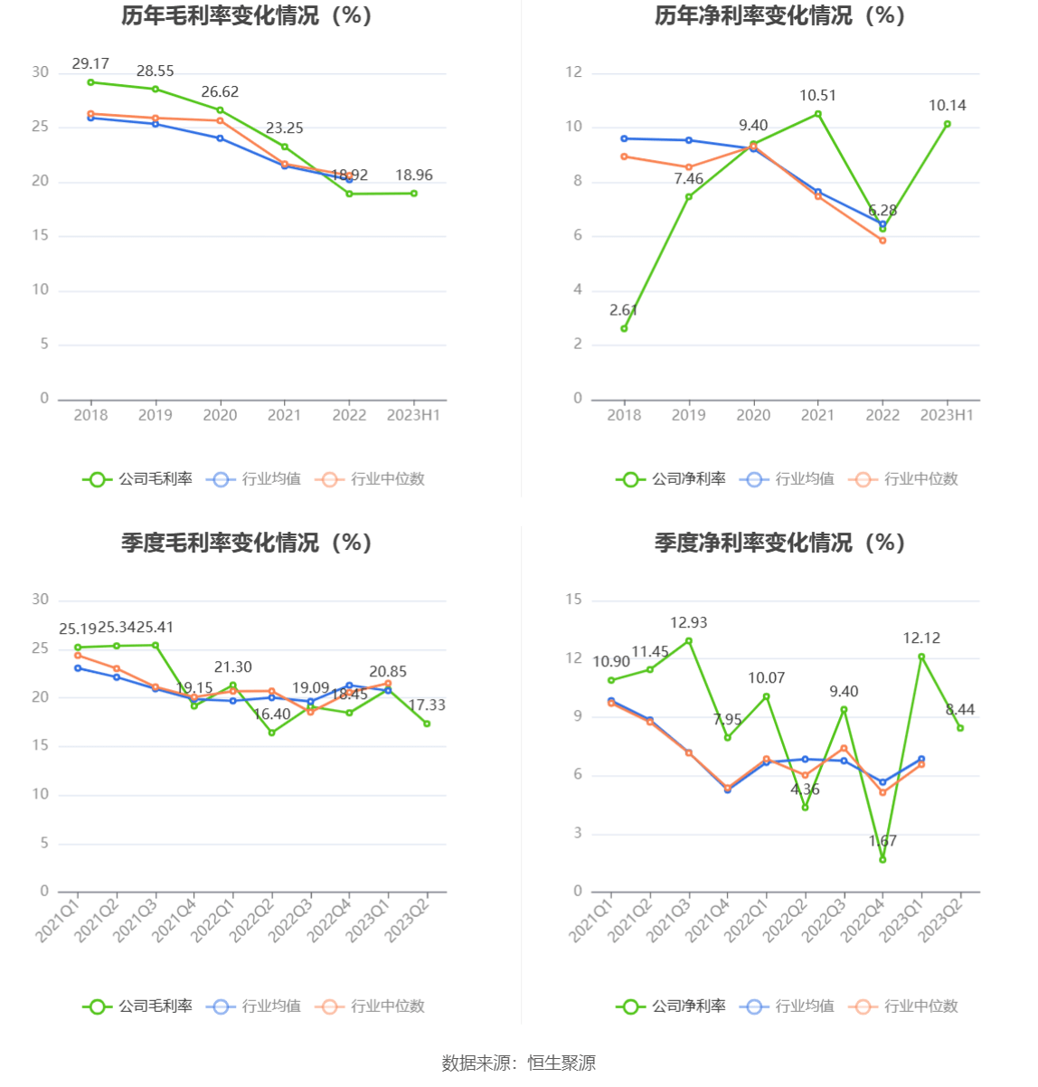 2023年上半年,公司毛利率为18.96%,同比下降0.18个百分点;净利率为10.14%,较上年同期上升2.58个百分点。从单季度指标来看,2023年第二季度公司毛利率为17.33%,同比上升0.93个百分点,环比下降3.52个百分点;净利率为8.44%,较上年同期上升4.08个百分点,较上一季度下降3.68个百分点。