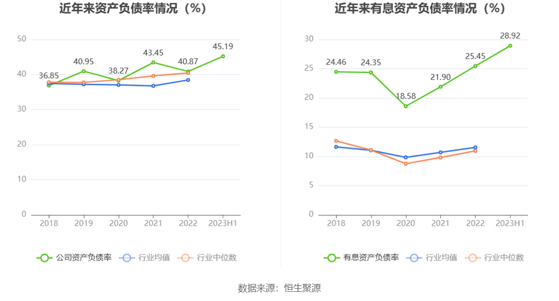 偿债能力方面,公司2023年二季度末资产负债率为45.19%,相比上年末增加4.32个百分点;有息资产负债率为28.92%,相比上年末增加3.47个百分点。