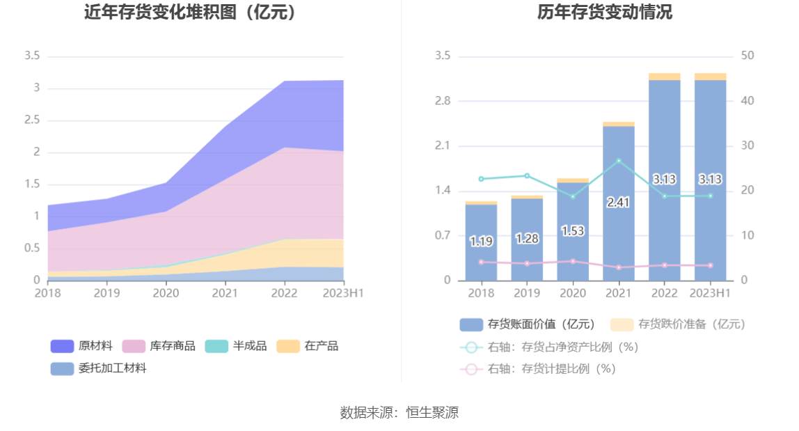 从存货变动来看,截至2023年上半年末,公司存货账面价值为3.13亿元,占净资产的18.93%,较上年末增加45.73万元。其中,存货跌价准备为1106.66万元,计提比例为3.41%。