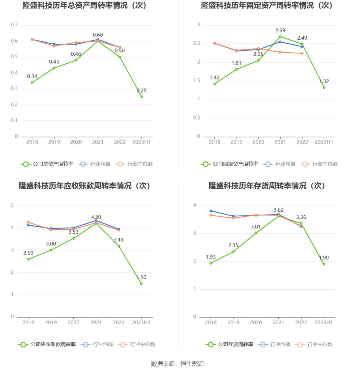 营运能力方面,2023年上半年,公司总资产周转率为0.25次,上年同期为0.28次(2022年上半年行业平均值为0.27次,公司位居同行业44/96);固定资产周转率为1.32次,上年同期为1.38次(2022年上半年行业平均值为1.21次,公司位居同行业37/96);公司应收账款周转率、存货周转率分别为1.50次、1.90次。