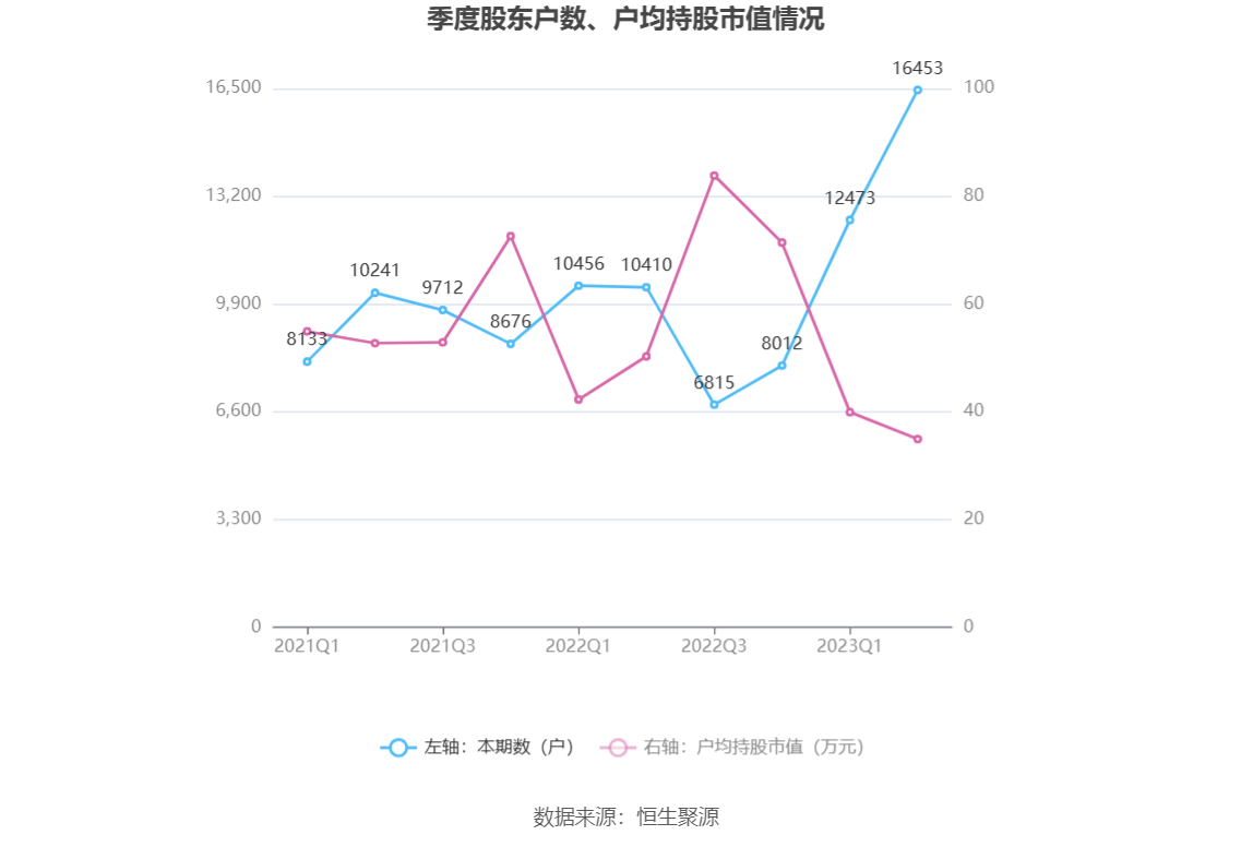筹码集中度方面,截至2023年二季度末,公司股东总户数为1.65万户,较一季度末增长了3980户,增幅31.91%;户均持股市值由一季度末的39.91万元下降至34.92万元,降幅为12.50%。