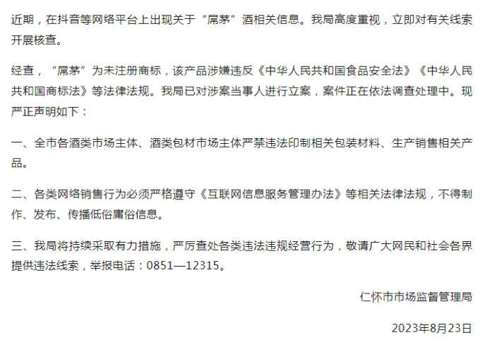 8月23日,贵州仁怀市场监管局在微信融媒体端发布声明,经查,“屌茅”为未注册商标,该产品涉嫌违反《中华人民共和国食品安全法》《中华人民共和国商标法》等法律法规。我局已对涉案当事人进行立案,案件正在依法调查处理中。