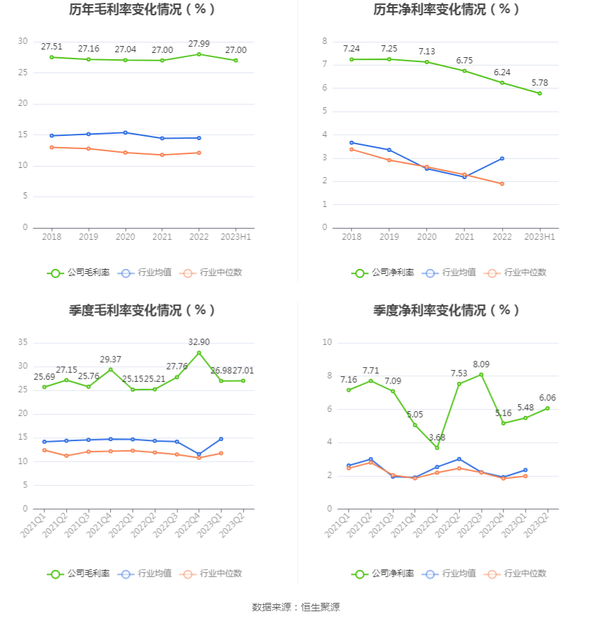 2023年上半年,公司毛利率为27.00%,同比上升1.82个百分点;净利率为5.78%,较上年同期持平。从单季度指标来看,2023年第二季度公司毛利率为27.01%,同比上升1.80个百分点,环比上升0.03个百分点;净利率为6.06%,较上年同期下降1.47个百分点,较上一季度上升0.58个百分点。