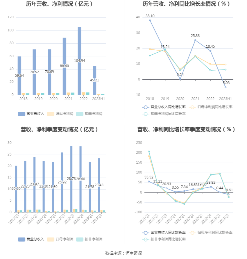 根据半年报,公司第二季度实现营业总收入23.43亿元,同比下降9.61%,环比增长7.58%;归母净利润9394.3万元,同比下降20.54%,环比增长15.93%;扣非净利润8453.19万元,同比下降23.35%,环比增长16.90%。