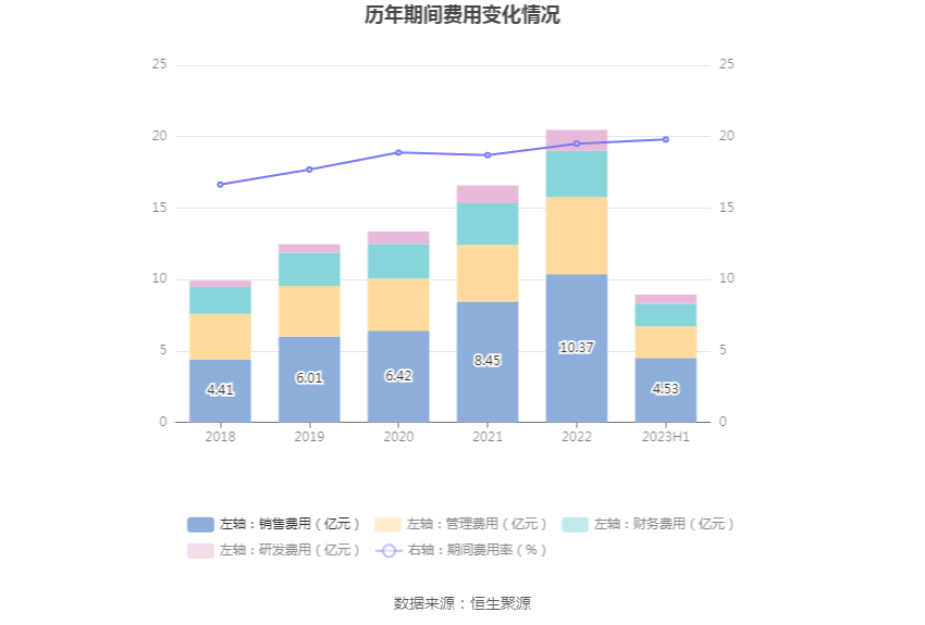 2023年上半年,公司期间费用为8.95亿元,较上年同期增加5429.12万元;期间费用率为19.80%,较上年同期上升2.14个百分点。其中,销售费用同比增长5.68%,管理费用同比增长8.26%,研发费用同比增长11.85%,财务费用同比增长4.11%。