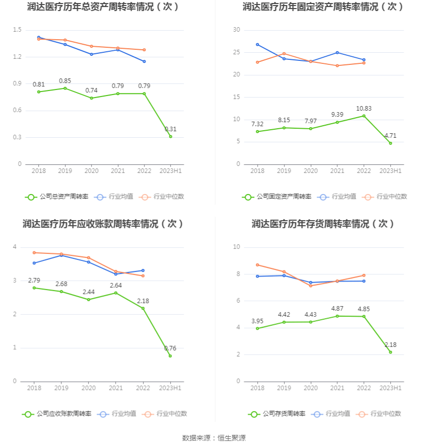 营运能力方面,2023年上半年,公司总资产周转率为0.31次,上年同期为0.37次(2022年上半年行业平均值为0.60次,公司位居同行业20/24);固定资产周转率为4.71次,上年同期为4.90次(2022年上半年行业平均值为11.46次,公司位居同行业20/24);公司应收账款周转率、存货周转率分别为0.76次、2.18次。