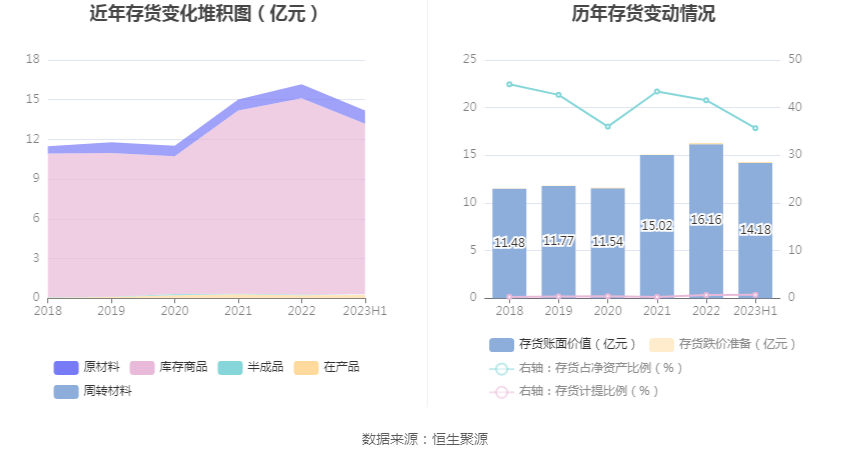 从存货变动来看,截至2023年上半年末,公司存货账面价值为14.18亿元,占净资产的35.69%,较上年末减少1.98亿元。其中,存货跌价准备为1016.99万元,计提比例为0.71%。