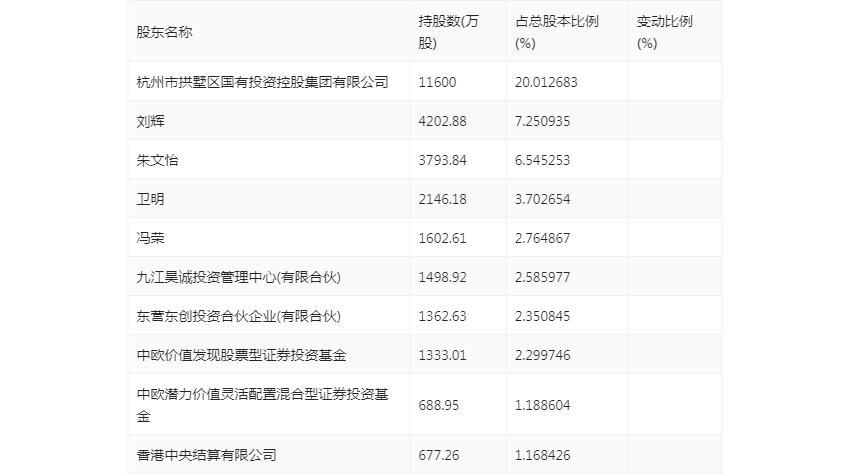 半年报显示,2023年上半年末的公司十大流通股东中,新进股东为香港中央结算有限公司,取代了一季度末的博恩添富7号私募证券投资基金。在具体持股比例上,中欧潜力价值灵活配置混合型证券投资基金持股有所上升,杭州市拱墅区国有投资控股集团有限公司、刘辉、朱文怡、卫明、冯荣、九江昊诚投资管理中心(有限合伙)、东营东创投资合伙企业(有限合伙)、中欧价值发现股票型证券投资基金持股有所下降。