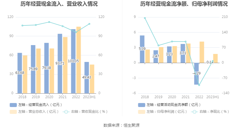 2023年上半年,公司营业收入现金比为109.34%,净现比为8.23%。
