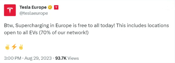 特斯拉补充道:如果你在欧洲,今天就可以在所有特斯拉超级充电站免费充电。