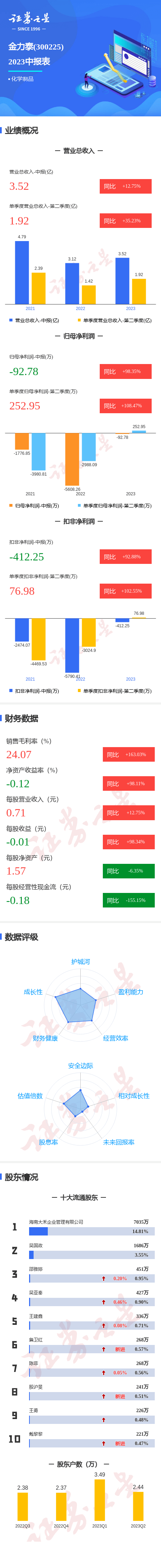金力泰2023中报显示,公司主营收入3.52亿元,同比上升12.75%;归母净利润-92.79万元,同比上升98.35%;扣非净利润-412.26万元,同比上升92.88%;其中2023年第二季度,公司单季度主营收入1.92亿元,同比上升35.23%;单季度归母净利润252.95万元,同比上升108.47%;单季度扣非净利润76.98万元,同比上升102.55%;负债率34.04%,投资收益34.96万元,财务费用79.24万元,毛利率24.07%。