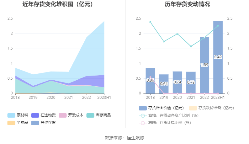 从存货变动来看,截至2023年上半年末,公司存货账面价值为2.42亿元,占净资产的2.27%。根据财报,公司本期没有计提存货跌价准备。