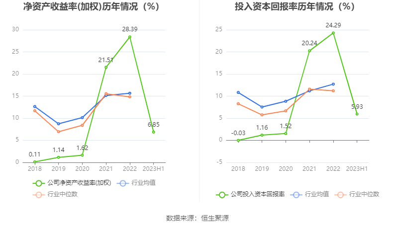 数据显示,2023年上半年公司加权平均净资产收益率为6.85%,较上年同期下降13.94个百分点;公司2023年上半年投入资本回报率为5.93%,较上年同期下降13.95个百分点。