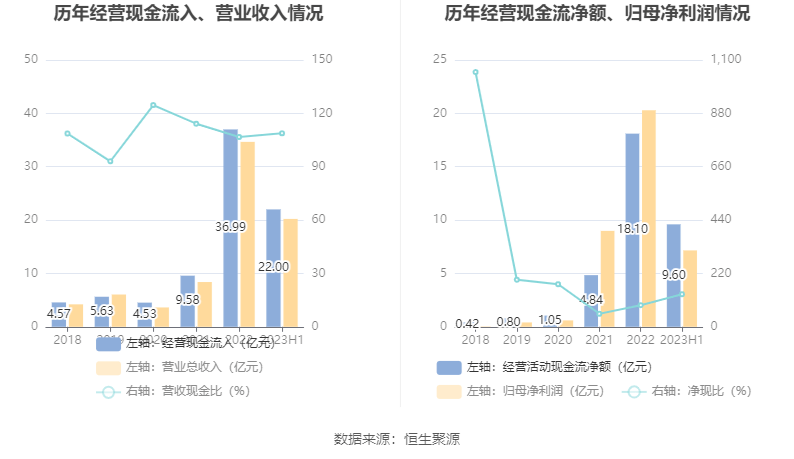 2023年上半年,公司营业收入现金比为108.79%,净现比为134.05%。