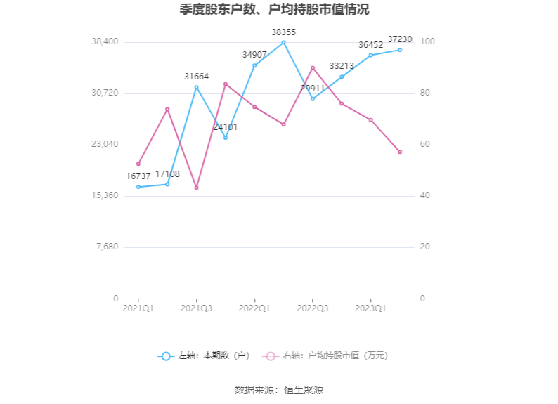 筹码集中度方面,截至2023年二季度末,公司股东总户数为3.72万户,较一季度末增长了778户,增幅2.13%;户均持股市值由一季度末的69.66万元下降至57.25万元,降幅为17.82%。