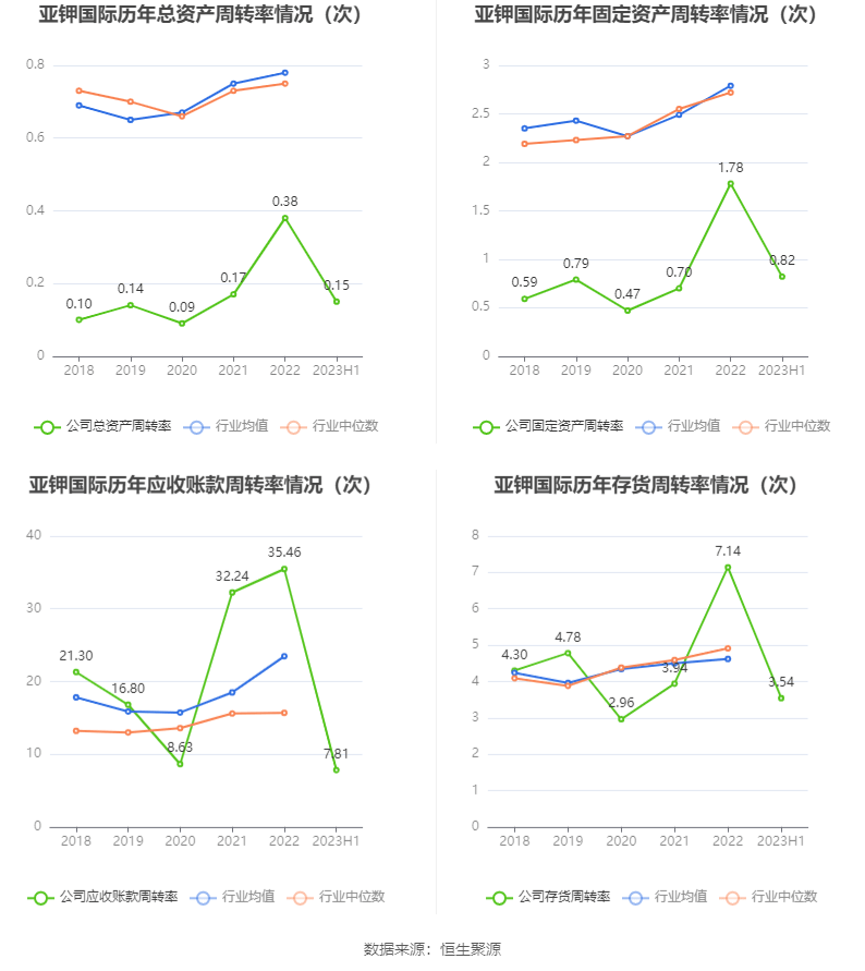 营运能力方面,2023年上半年,公司总资产周转率为0.15次,上年同期为0.28次(2022年上半年行业平均值为0.44次,公司位居同行业52/59);固定资产周转率为0.82次,上年同期为1.07次(2022年上半年行业平均值为1.52次,公司位居同行业43/59);公司应收账款周转率、存货周转率分别为7.81次、3.54次。
