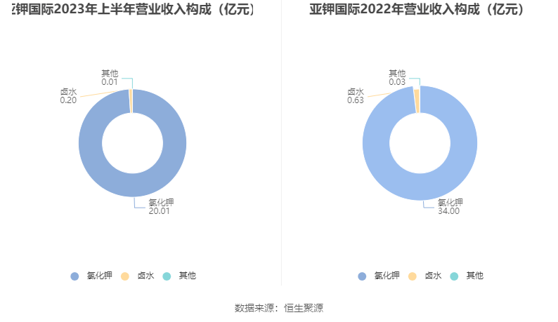 分产品来看,2023年上半年公司主营业务中,氯化钾收入20.01亿元,同比增长15.68%,占营业收入的98.96%;卤水收入0.20亿元,同比下降40.67%,占营业收入的0.99%。