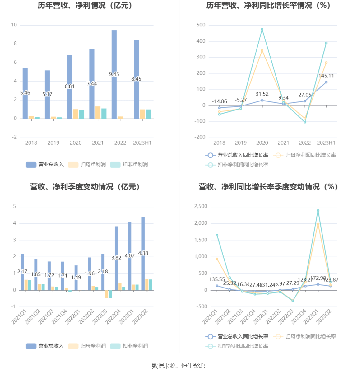 根据半年报,公司第二季度实现营业总收入4.38亿元,同比增长123.87%,环比增长7.63%;归母净利润6553.88万元,同比增长156.93%,环比增长92.17%;扣非净利润6530.35万元,同比增长246.59%,环比增长94.81%。