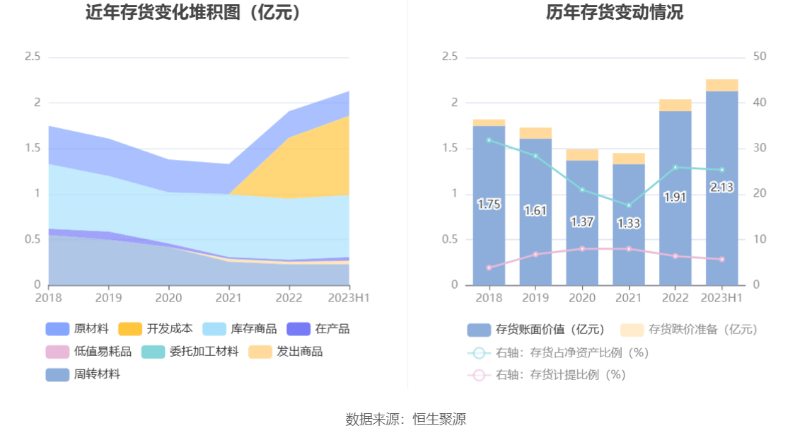 从存货变动来看,截至2023年上半年末,公司存货账面价值为2.13亿元,占净资产的25.35%,较上年末增加2140.94万元。其中,存货跌价准备为1286.66万元,计提比例为5.7%。