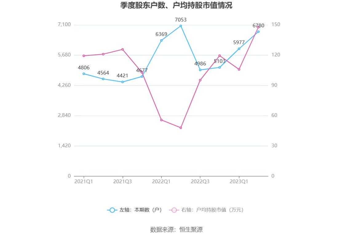 筹码集中度方面,截至2023年二季度末,公司股东总户数为6780户,较一季度末增长了803户,增幅13.43%;户均持股市值由一季度末的105.85万元上升至147.79万元,增幅为39.62%。
