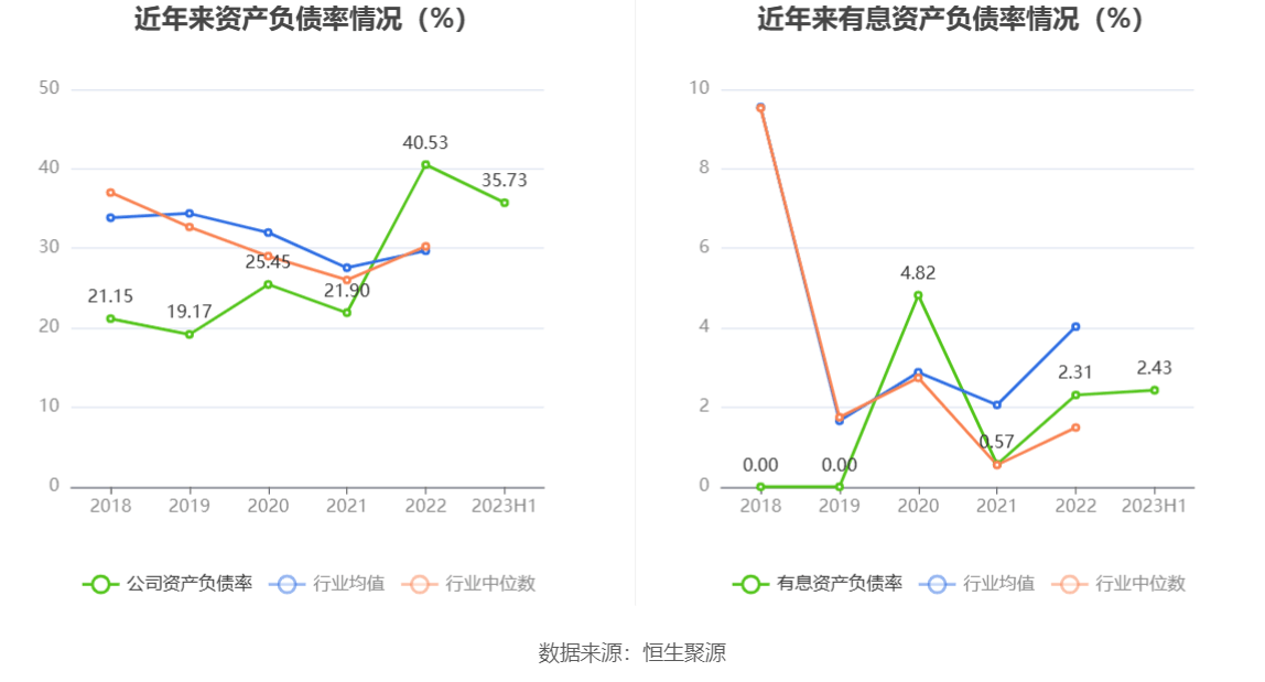 偿债能力方面,公司2023年二季度末资产负债率为35.73%,相比上年末减少4.80个百分点;有息资产负债率为2.43%,相比上年末增加0.12个百分点。