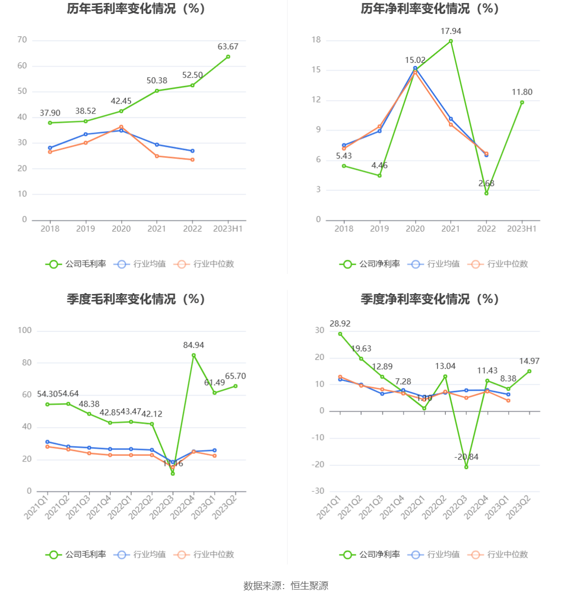2023年上半年,公司毛利率为63.67%,同比上升20.97个百分点;净利率为11.80%,较上年同期上升3.92个百分点。从单季度指标来看,2023年第二季度公司毛利率为65.70%,同比上升23.58个百分点,环比上升4.21个百分点;净利率为14.97%,较上年同期上升1.93个百分点,较上一季度上升6.59个百分点。