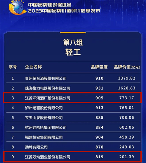 今年5月,在“2023中国品牌价值信息发布暨中国品牌建设高峰论坛”上,洋河股份的品牌价值再创新高,以773.17亿元进入轻工榜第三(白酒行业第二)。双沟酒业以201.39亿元的品牌价值位列第九,表现同样抢眼。这凸显出洋河强劲的企业实力和品牌魅力。
