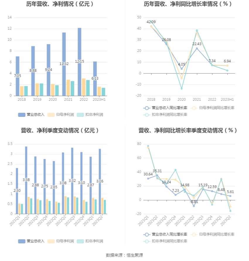 根据半年报,公司第二季度实现营业总收入3.26亿元,同比增长5.61%,环比增长13.37%;归母净利润8055.58万元,同比下降9.45%,环比下降0.01%;扣非净利润6963.59万元,同比下降15.77%,环比下降4.01%。