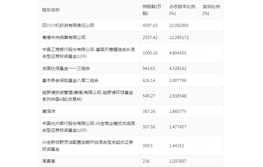 半年报显示,2023年上半年末的公司十大流通股东中,持股最多的为四川川机投资有限责任公司,占比22.08%。十大流通股东名单相比2023年一季报维持不变。在具体持股比例上,香港中央结算有限公司、中国光大银行股份有限公司-兴全商业模式优选混合型证券投资基金(LOF)、兴全新视野灵活配置定期开放混合型发起式证券投资基金持股有所下降。