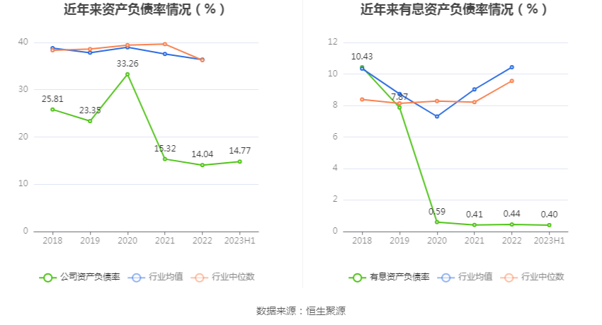 偿债能力方面,公司2023年二季度末资产负债率为14.77%,相比上年末增加0.73个百分点;有息资产负债率为0.40%,相比上年末减少0.04个百分点。