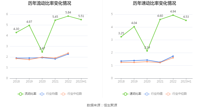 2023年上半年,公司流动比率为5.51,速动比率为4.53。