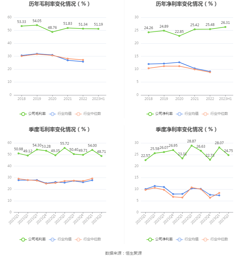 2023年上半年,公司毛利率为51.19%,同比下降1.58个百分点;净利率为26.31%,较上年同期上升0.01个百分点。从单季度指标来看,2023年第二季度公司毛利率为48.71%,同比下降7.01个百分点,环比下降5.29个百分点;净利率为24.75%,较上年同期下降4.12个百分点,较上一季度下降3.32个百分点。