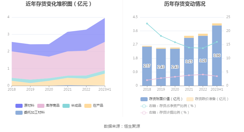 从存货变动来看,截至2023年上半年末,公司存货账面价值为3.96亿元,占净资产的16.03%,较上年末增加6828.88万元。其中,存货跌价准备为1432.38万元,计提比例为3.49%。