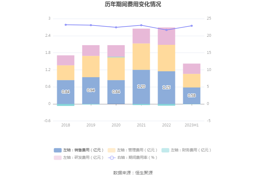 2023年上半年,公司期间费用为1.41亿元,较上年同期增加1421.61万元;期间费用率为22.92%,较上年同期上升0.89个百分点。其中,销售费用同比增长6.06%,管理费用同比增长0.7%,研发费用同比增长32.64%,财务费用由去年同期的-258.48万元变为-82.58万元。
