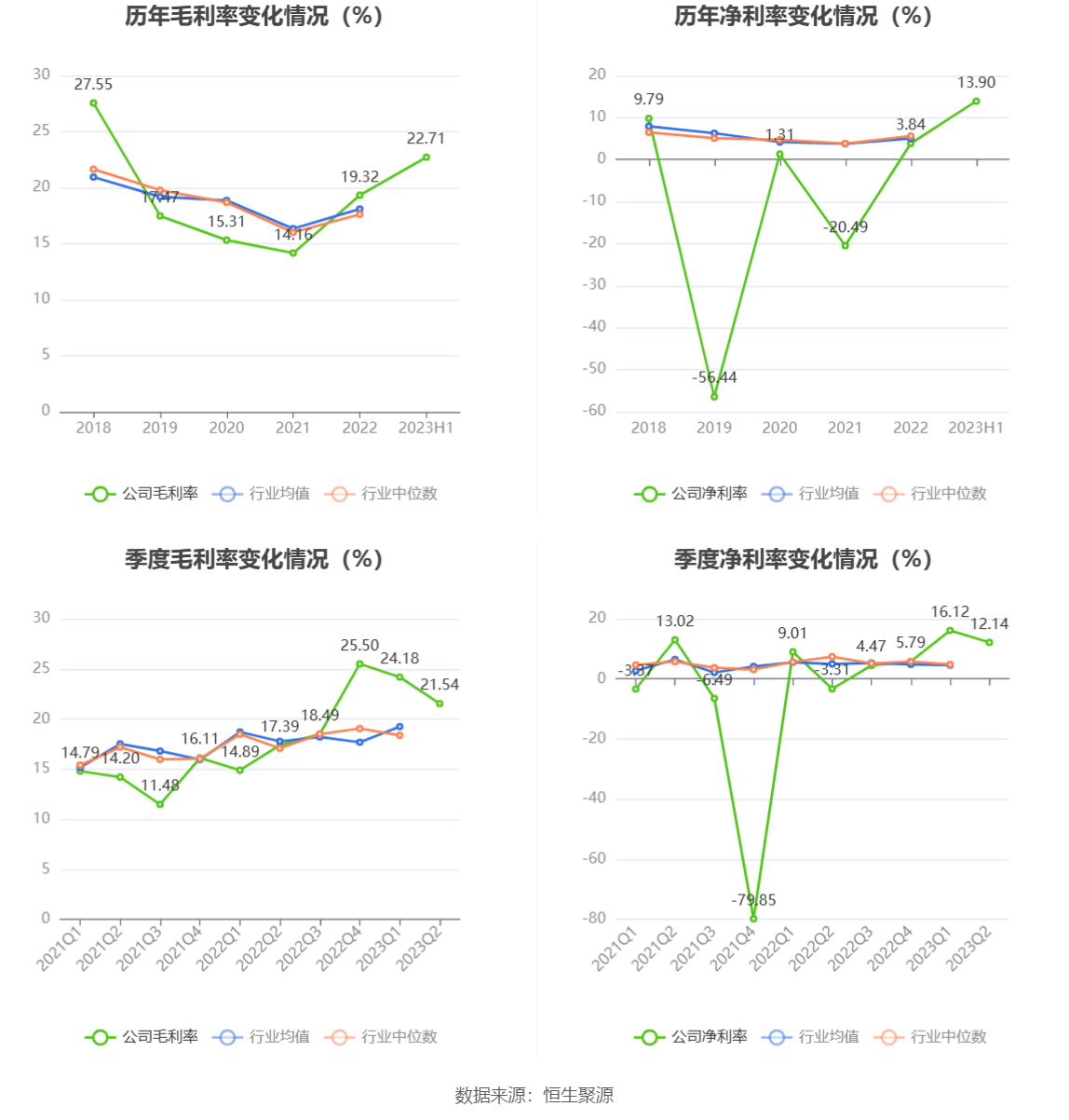 2023年上半年,公司毛利率为22.71%,同比上升6.46个百分点;净利率为13.90%,较上年同期上升11.58个百分点。从单季度指标来看,2023年第二季度公司毛利率为21.54%,同比上升4.15个百分点,环比下降2.64个百分点;净利率为12.14%,较上年同期上升15.45个百分点,较上一季度下降3.98个百分点。