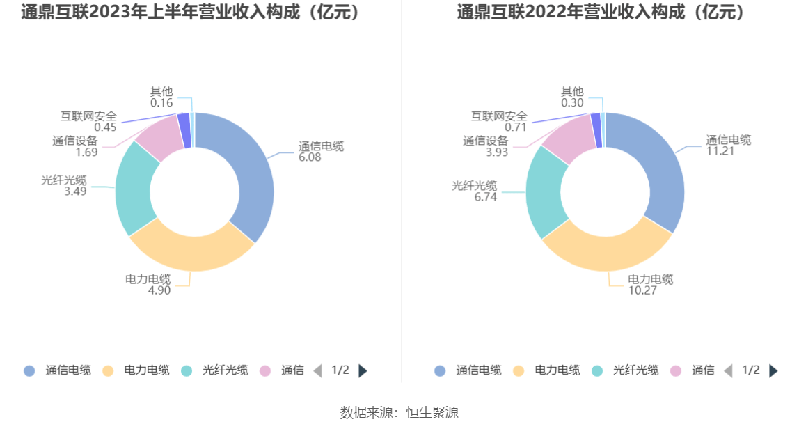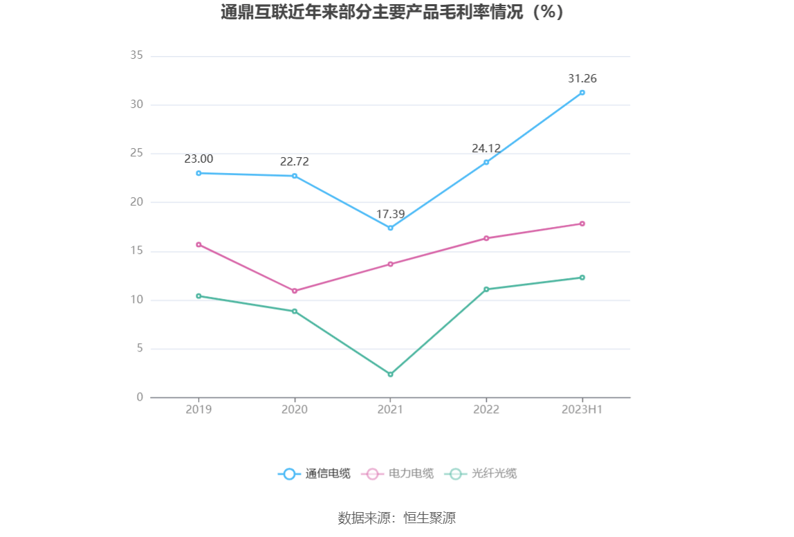 分产品看,通信电缆、电力电缆、光纤光缆2023年上半年毛利率分别为31.26%、17.83%、12.31%。