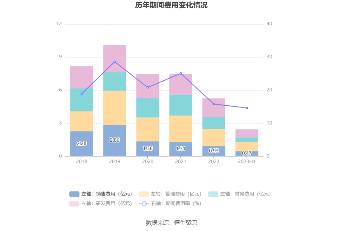 2023年上半年,公司期间费用为2.45亿元,较上年同期增加3.47万元;但期间费用率为14.61%,较上年同期下降1.52个百分点。其中,销售费用同比增长17.74%,管理费用同比增长5.23%,研发费用同比增长1.9%,财务费用同比下降22.77%。
