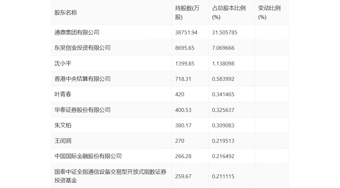 半年报显示,2023年上半年末的公司十大流通股东中,新进股东为东吴创业投资有限公司、华泰证券股份有限公司、王闰润、中国国际金融股份有限公司、国泰中证全指通信设备交易型开放式指数证券投资基金,取代了一季度末的东吴创业投资有限公司-苏州市吴企创基股权投资合伙企业(有限合伙)、黄奇俊、汪威、陈浩、田志花。在具体持股比例上,香港中央结算有限公司、朱文柏持股有所上升,叶青春持股有所下降。