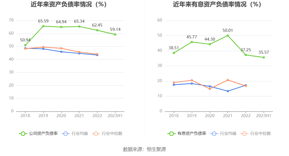 偿债能力方面,公司2023年二季度末资产负债率为59.14%,相比上年末减少3.31个百分点;有息资产负债率为35.57%,相比上年末减少1.68个百分点。