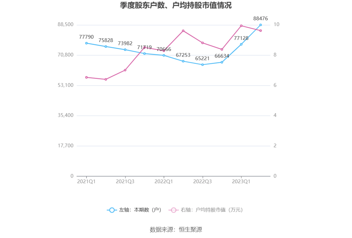 筹码集中度方面,截至2023年二季度末,公司股东总户数为8.85万户,较一季度末增长了1.13万户,增幅14.71%;户均持股市值由一季度末的9.94万元下降至9.62万元,降幅为3.22%。