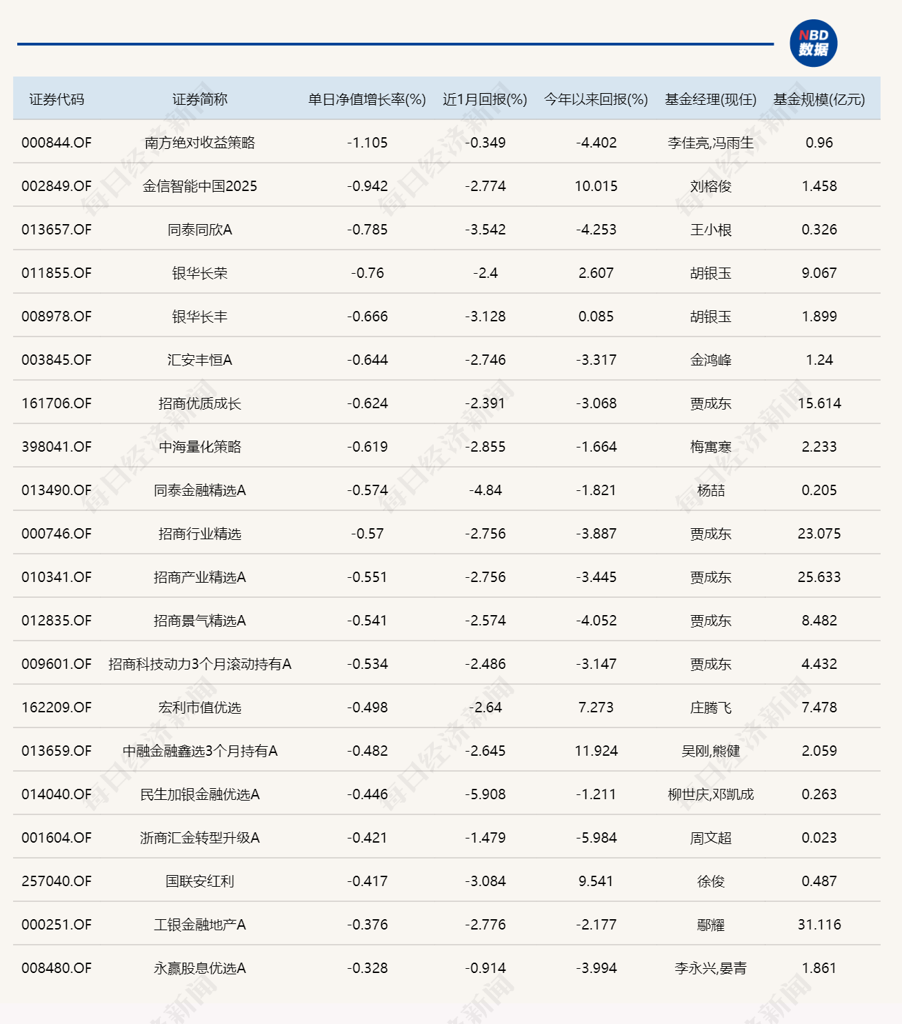 跌幅榜方面,其实今日领跌基金的绝对跌幅都不大,仅一只跌超1%,这里不展开点评。