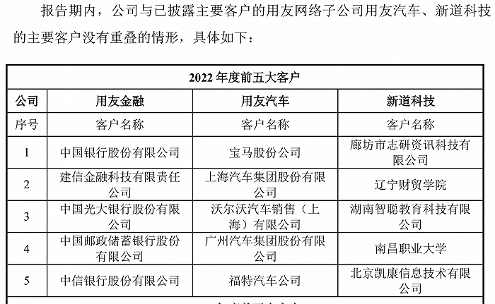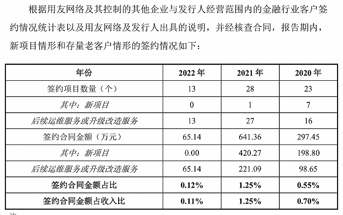 不过用友网络及其控制的其他子公司也确实有金融行业的客户。在问询函中有显示,针对挂牌后至报告期内,仍存在用友网络及其控制的其他子公司为用友金融经营范围内的金融机构客户提供服务等违反约束机制的情形,2022年3月底,用友网络出具说明,后续将采取新老划断措施,已生效但尚未履行完毕的合同由关联方继续提供服务直至合同履行完毕,后续新增业务由用友金融承接。