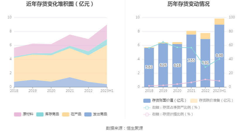 从存货变动来看,截至2023年上半年末,公司存货账面价值为8.98亿元,占净资产的40.49%,较上年末增加2.07亿元。其中,存货跌价准备为8695.87万元,计提比例为8.83%。