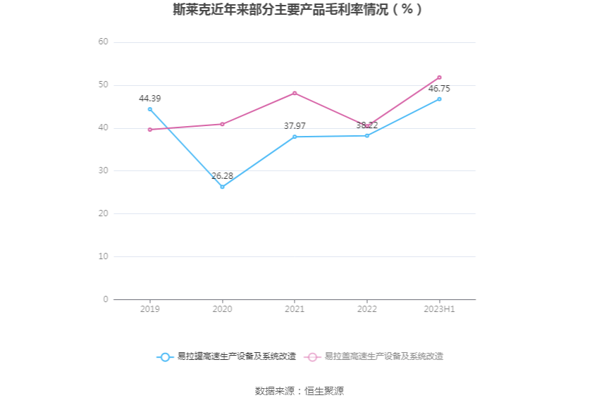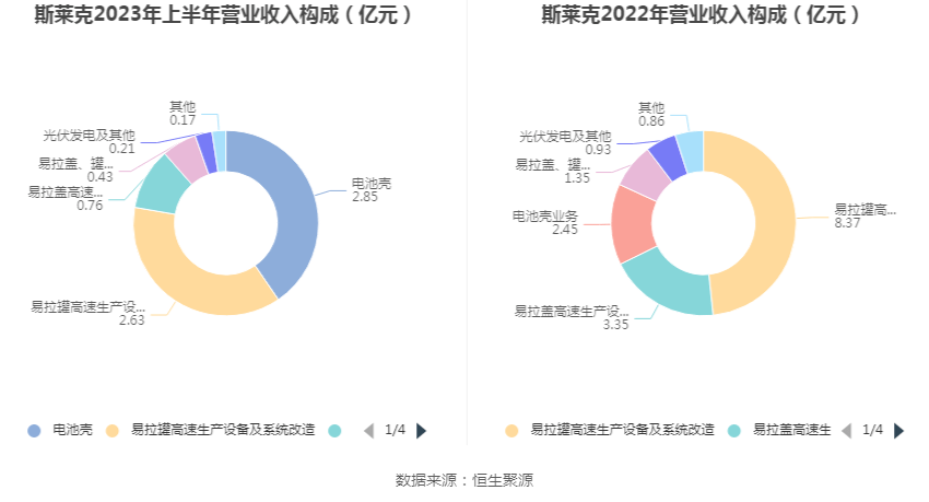 分产品看,电池壳、易拉罐高速生产设备及系统改造、易拉盖高速生产设备及系统改造2023年上半年毛利率分别为5.02%、46.75%、51.80%。