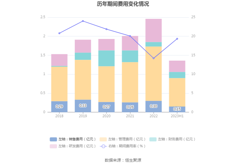 2023年上半年,公司期间费用为1.36亿元,较上年同期增加4012.84万元;期间费用率为19.35%,较上年同期上升4.73个百分点。其中,销售费用同比增长21.5%,管理费用同比增长25.95%,研发费用同比增长63.76%,财务费用同比增长173.14%。