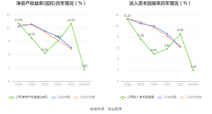 数据显示,2023年上半年公司加权平均净资产收益率为2.62%,较上年同期下降3.01个百分点;公司2023年上半年投入资本回报率为1.95%,较上年同期下降2.17个百分点。