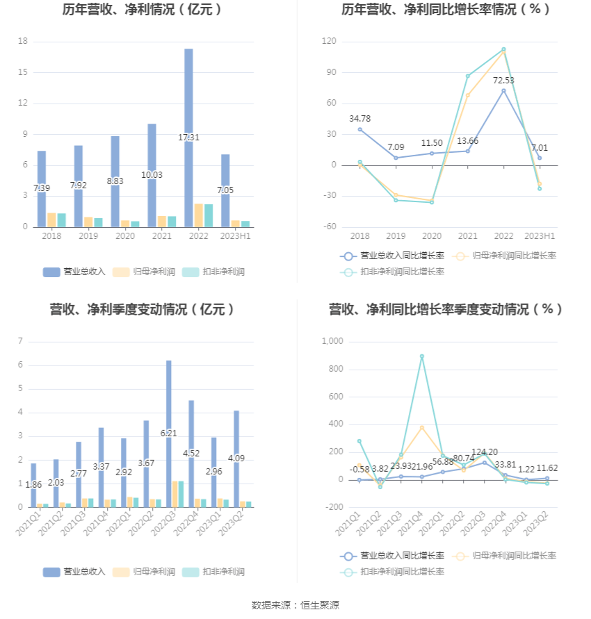 根据半年报,公司第二季度实现营业总收入4.09亿元,同比增长11.62%,环比增长38.47%;归母净利润2639.09万元,同比下降23.59%,环比下降29.90%;扣非净利润2508.14万元,同比下降27.19%,环比下降24.72%。