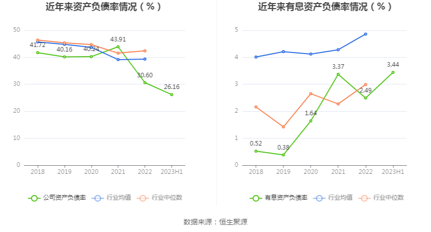 偿债能力方面,公司2023年二季度末资产负债率为26.16%,相比上年末减少4.44个百分点;有息资产负债率为3.44%,相比上年末增加0.95个百分点。