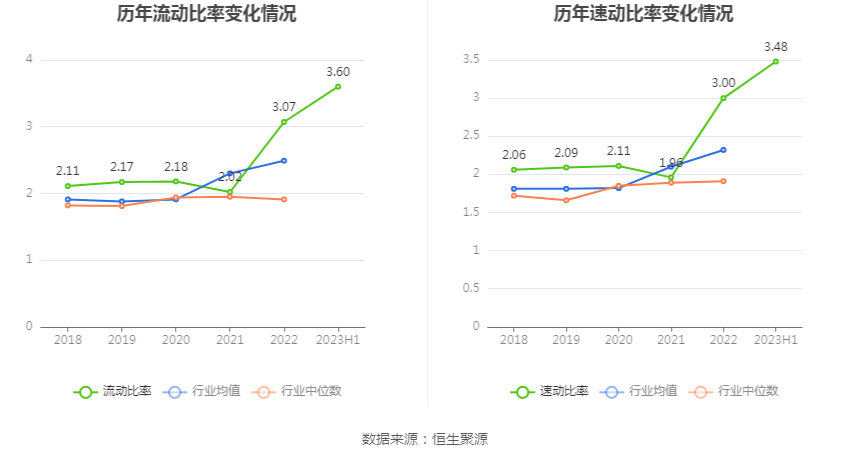 2023年上半年,公司流动比率为3.60,速动比率为3.48。
