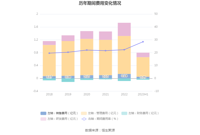 2023年上半年,公司期间费用为7533.33万元,较上年同期增加1225.61万元;期间费用率为28.49%,较上年同期上升3.23个百分点。其中,销售费用同比增长27.82%,管理费用同比增长15.76%,研发费用同比增长15.57%,财务费用由去年同期的-519.80万元变为-411.35万元。